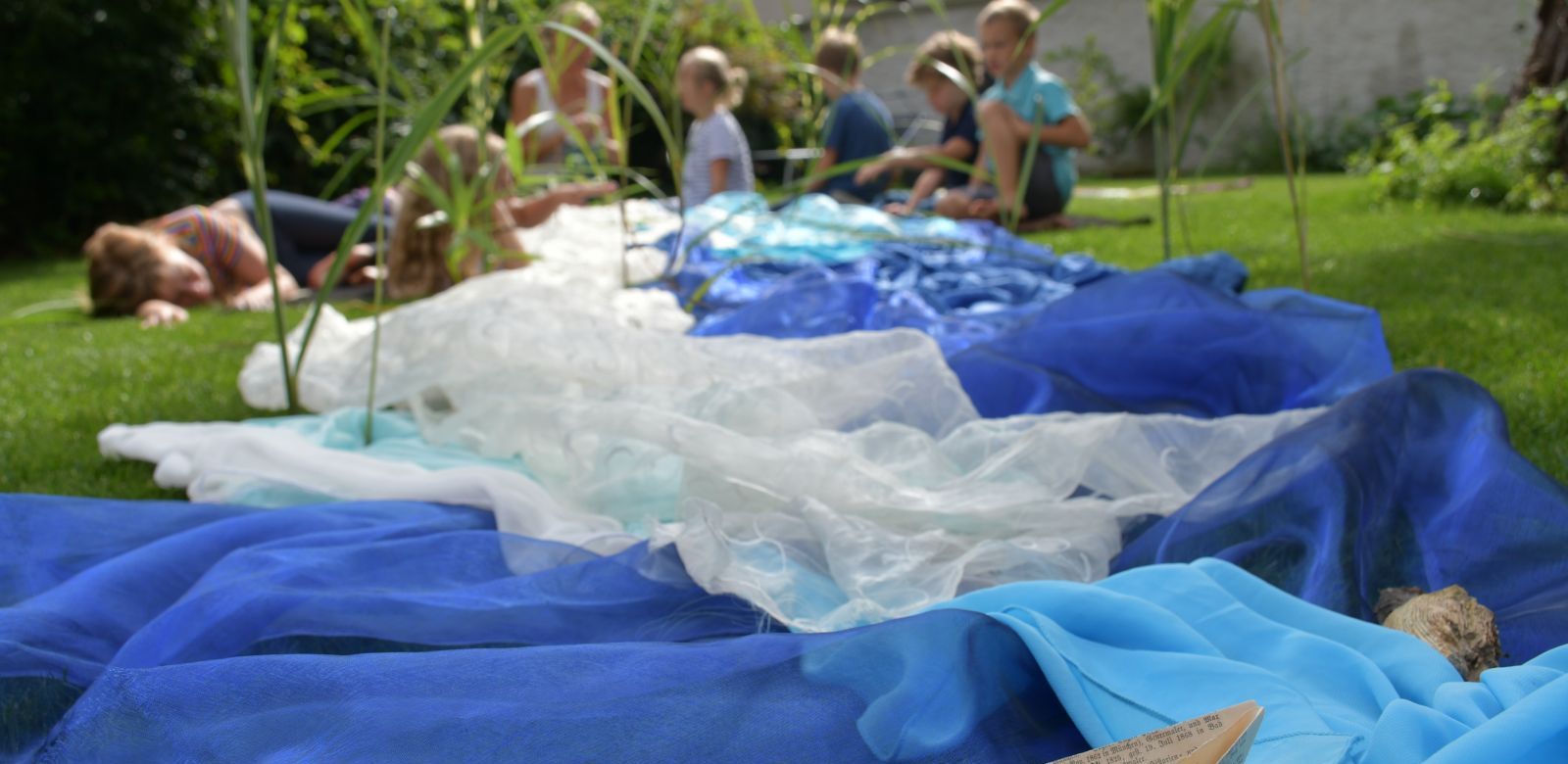Begleitet von Friedrich Smetanas „Die Moldau“ stellten wir den Verlauf eines Flusses mit unserem Körper dar und erlebten das Bilderbuch „Der Fluss“ an unserem selbstgestalteten Fluss im Garten.